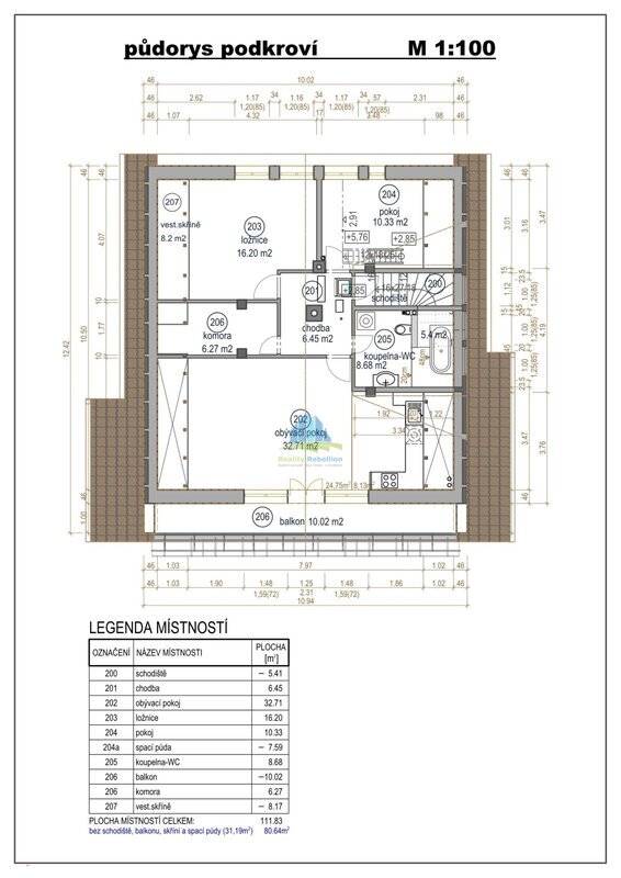 pod střechou. Místnosti jsou odděleny chodbou a doplněny komorou a koupelnou